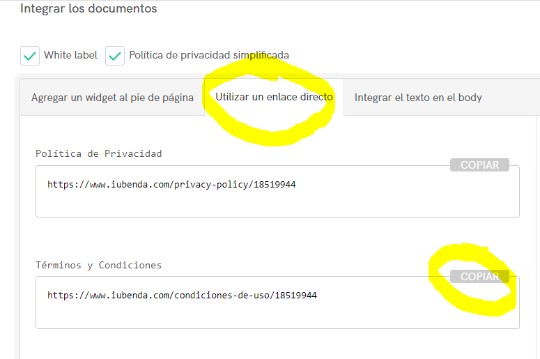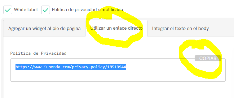 - No tendrás que Crear las Páginas de las políticas en tu web, simplemente pondrás un enlace a la web de iubenda, donde estarán redactadas y actualizadas.