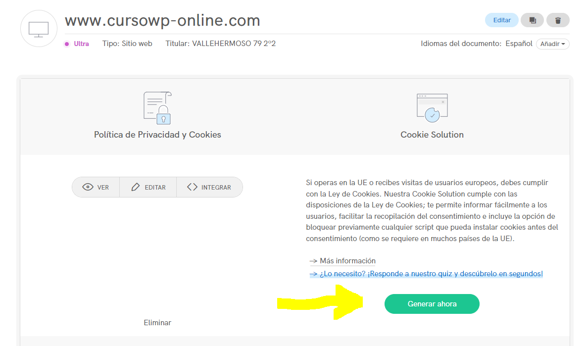 - Paso 1: Pulsa en Cookie Solution > GENERAR AHORA