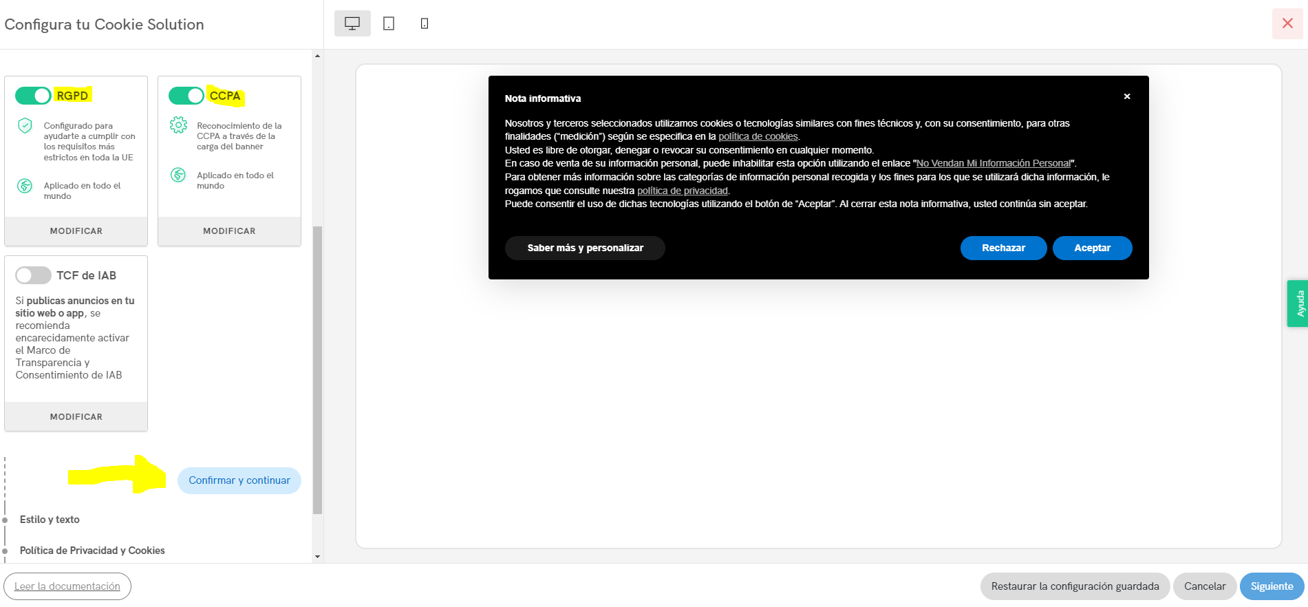 - Paso 3: Selecciona las leyes que quieres cumplir. TCF de IAB solo debes marcarlo si en tu web publicas anuncios de terceros (Google Adsense…)