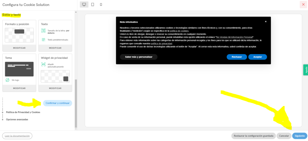 - Paso 4: Selecciona el estilo, colores, posición del baner y pulsa en GUARDAR Y CONTINUAR y luego en SIGUIENTE (abajo a la derecha)