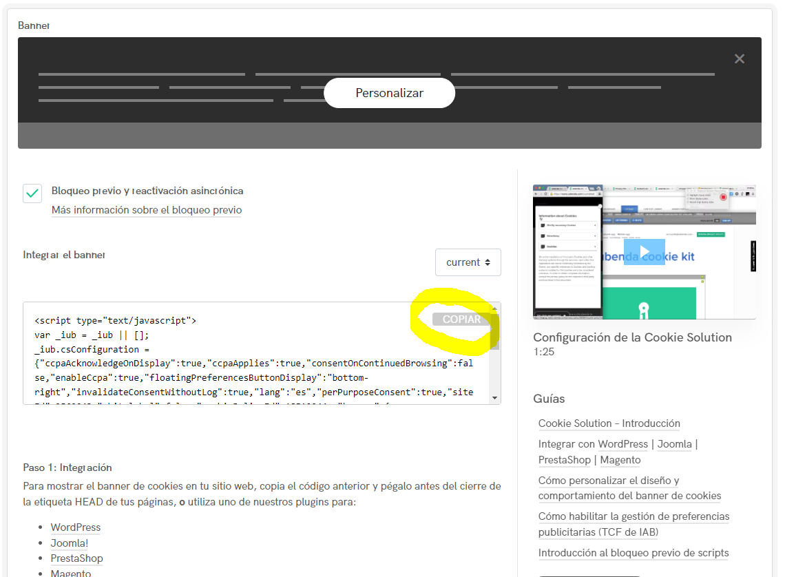 - Paso 5: Copia el código (si no lo encuentras pulsa en INTEGRAR en Cookie Solution)