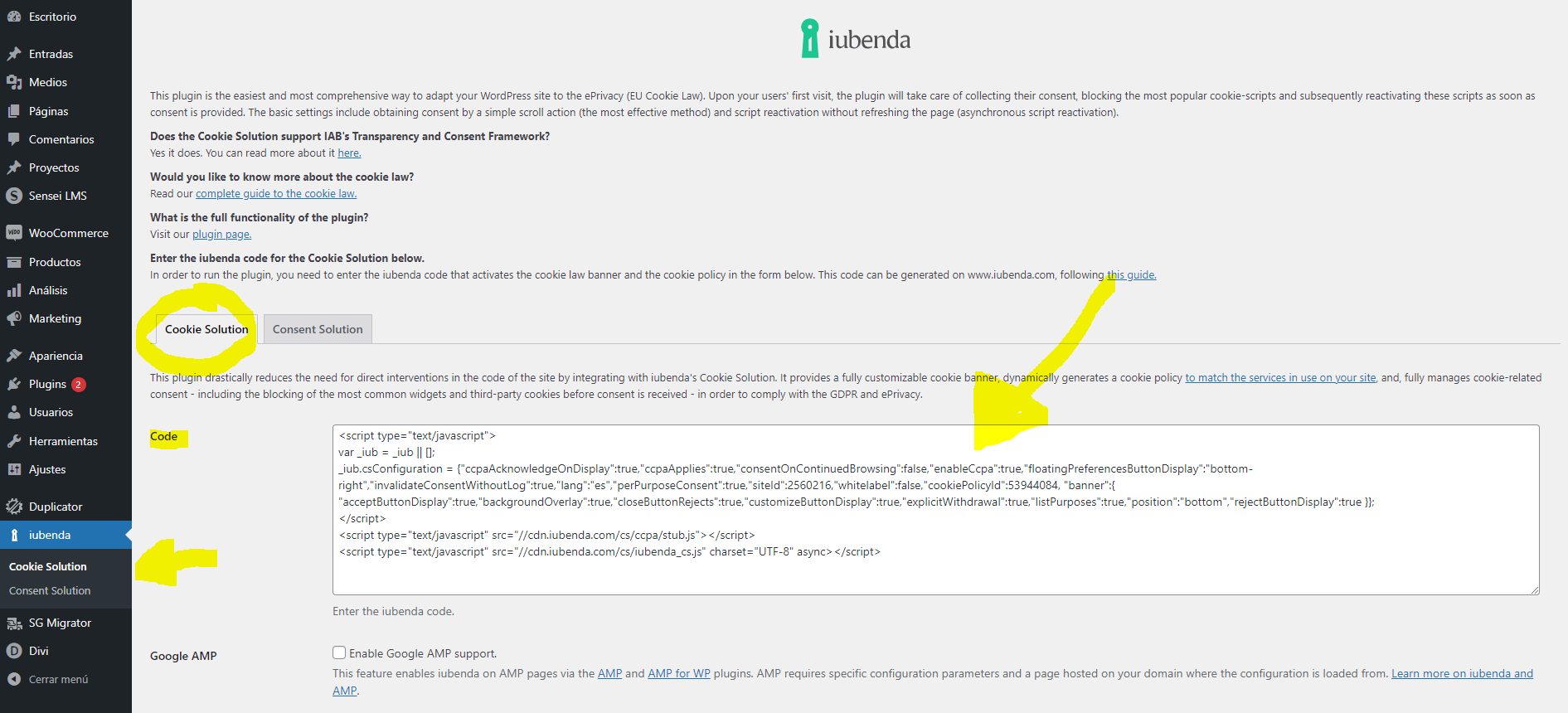 - Paso 6: Descarga el plugin iubenda en tu web, actívalo y pega el código en la caja de CODE