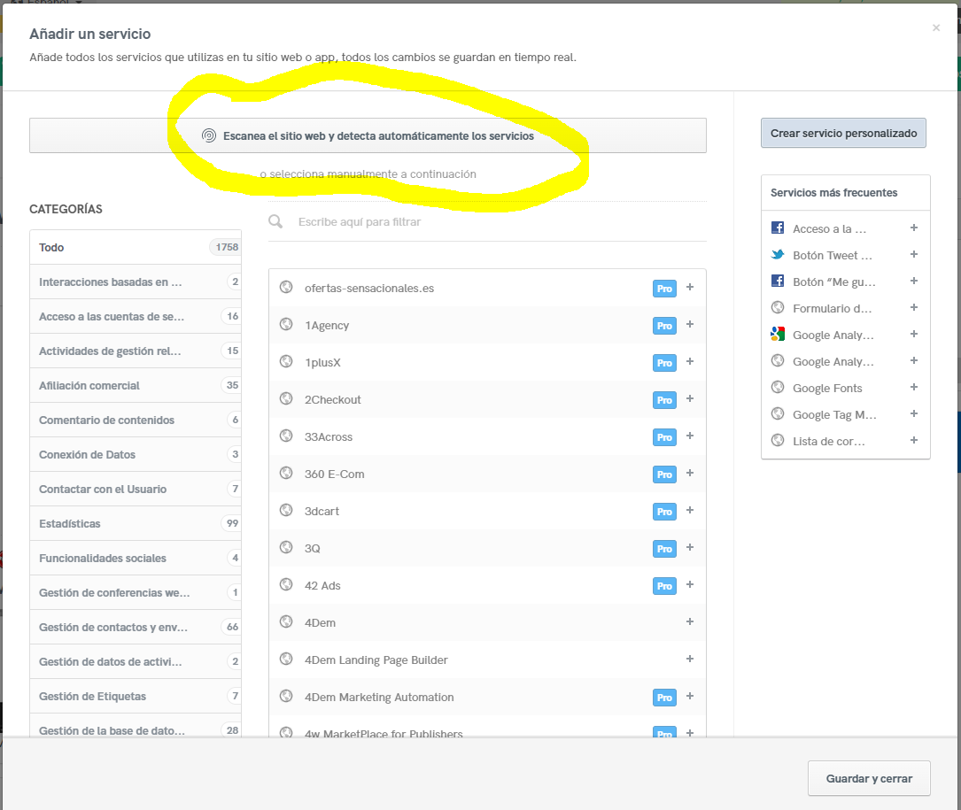 - Si no sabes qué servicios añadir, puedes pulsar en ESCANEA EL SITIO WEB Y DETECTA AUTOMÁTICAMENTE LOS SERVICIOS