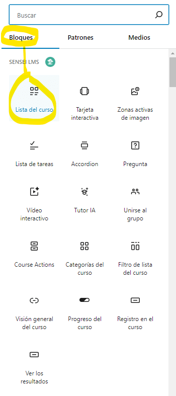 Para usar este nuevo diseño de cuadrícula en la PÁGINA DE MIS CURSOS, agrega el bloque de Gutenberg LISTA DEL CURSO a la página Mis cursos y selecciona Vista de cuadrícula en la barra de herramientas del bloque o en la configuración.