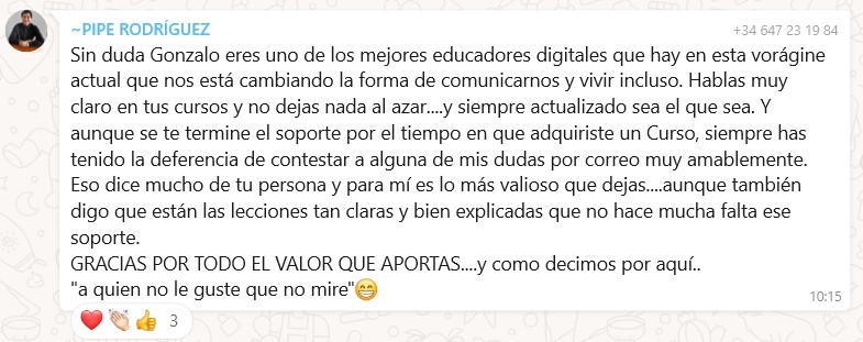 Si alguien me preguntase, ¿recomendarías el curso?, “¿enamora tanto como dice Gonzalo?”, yo sin pensármelo dos veces os diría: SI!!!. Merece la pena, aprendes mucho, lo tienes para siempre y además Gonzalo está al otro lado para ayudarte a resolver.