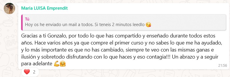 Sin duda es la mejor inversión en formación que he hecho en mi vida. Es para mí un honor seguir los pasos de un experto como tú.