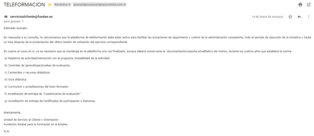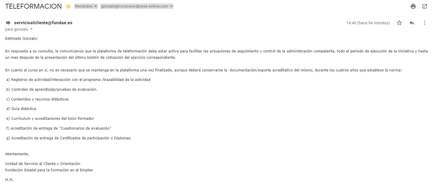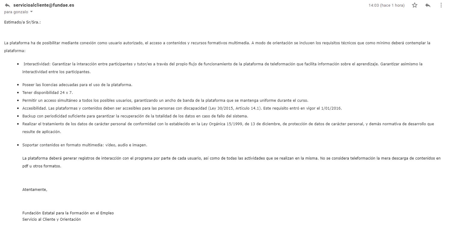 Lo primero que quiero que veas es el email que manda Fundae con los requisitos que debe cumplir tu Academia o Plataforma de Cursos Online para que veas que no lo digo yo, lo dicen ellos y por escrito con lo que es información 100% oficial: