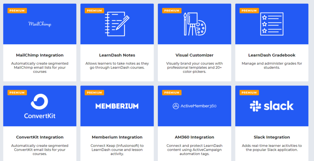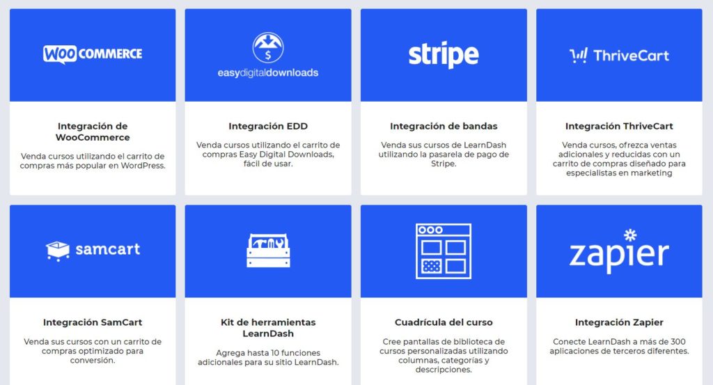 Learndash también cuenta con un montón de extensiones premium. En ambos posiblemente muchas más de las que vas a necesitar. Aquí te dejo algunas de ellas: