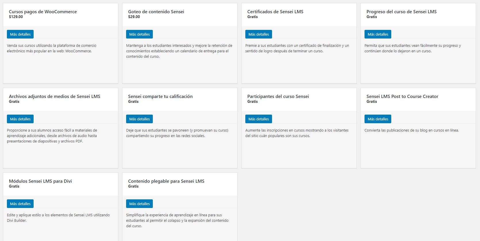 Automattic, (empresa de Mat Mullenweb, fundador de WordPress) tiene un panel dentro de Sensei para que dentro de tu web puedas ver las extensiones.