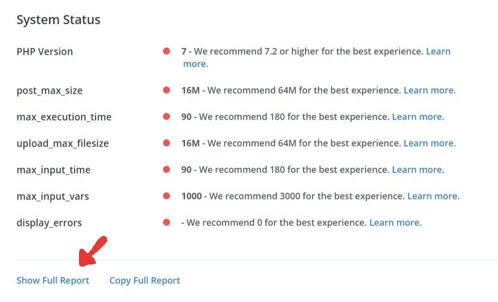 Pulsa en SHOW FULL REPORT para ver el reporte completo, si quieres, y ver qué requisitos cumple tu hosting y cuáles no.