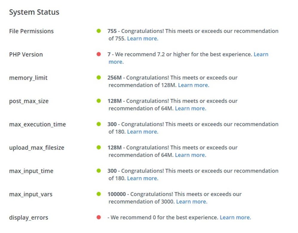 Como puedes ver el primer valor es lo que tienes actualmente en tu hosting y el segundo valor que ves después de We recommendes el que deberías tener para que todo te funcione correctamente.