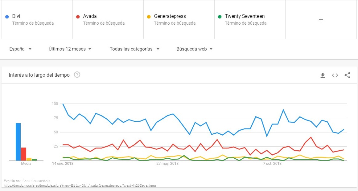 Y mira ahora la tendencia de búsquedas de Divi comparado con otros temas de WordPress según Google Trends. Como verás las tendencias demuestran que Divi es el tema de WordPress que más interés despierta, solo seguido de Avada y ya muy de lejos otros como GeneratePress o Twenty Seventeen.