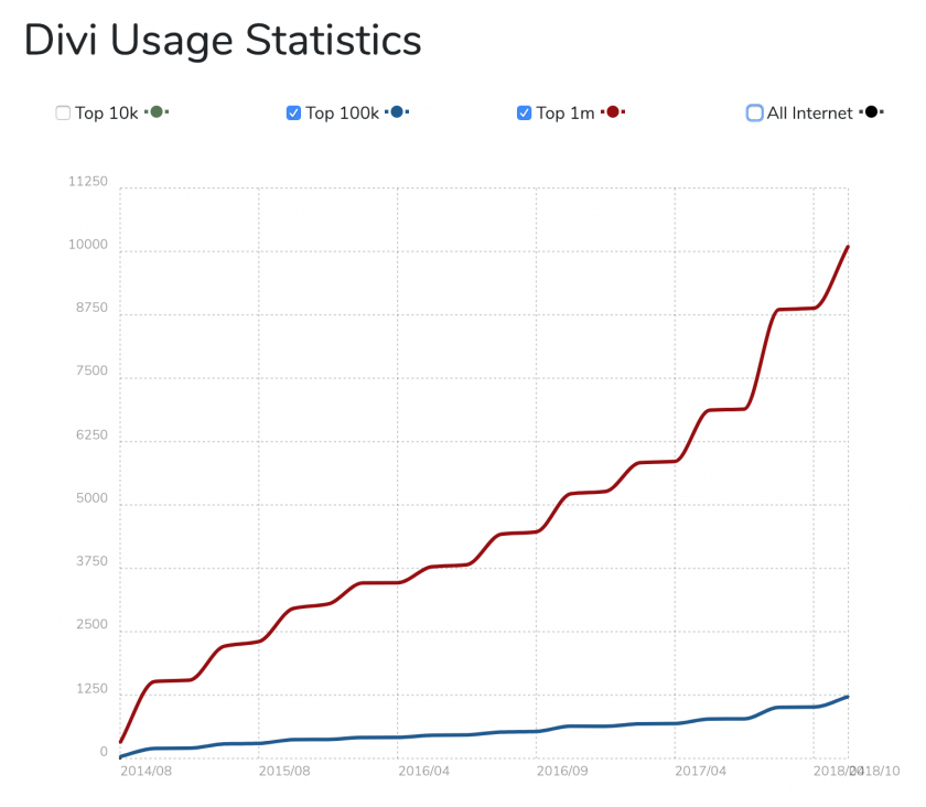Como podéis ver en el gráfico y pese a lo que algunos podían desconocer Divi está muy por encima del resto. Le sigue Avada y otros temas populares como Genesis, GeneratePress, etc ni aparecen en la gráfica. Esto no es una opinión de si Divi es el mejor o no lo es, esto son datos reales de los usuarios que confian en Divi para diseñar su web.