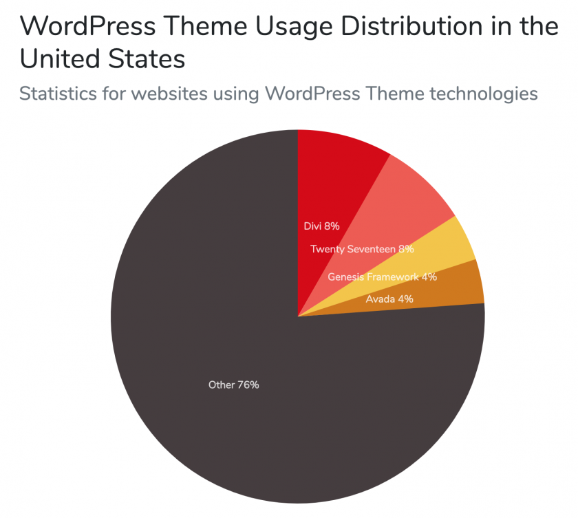 Como podéis ver, el Tema Divi lidera la clasificación. En WordPress, Divi es el tema en el que más confían los usuarios de todo el mundo. Solo le sigue de cerca Twenty Seventeen porque es un tema gratuito que viene preinstalado con WordPress y ni siquiera así supera a Divi.